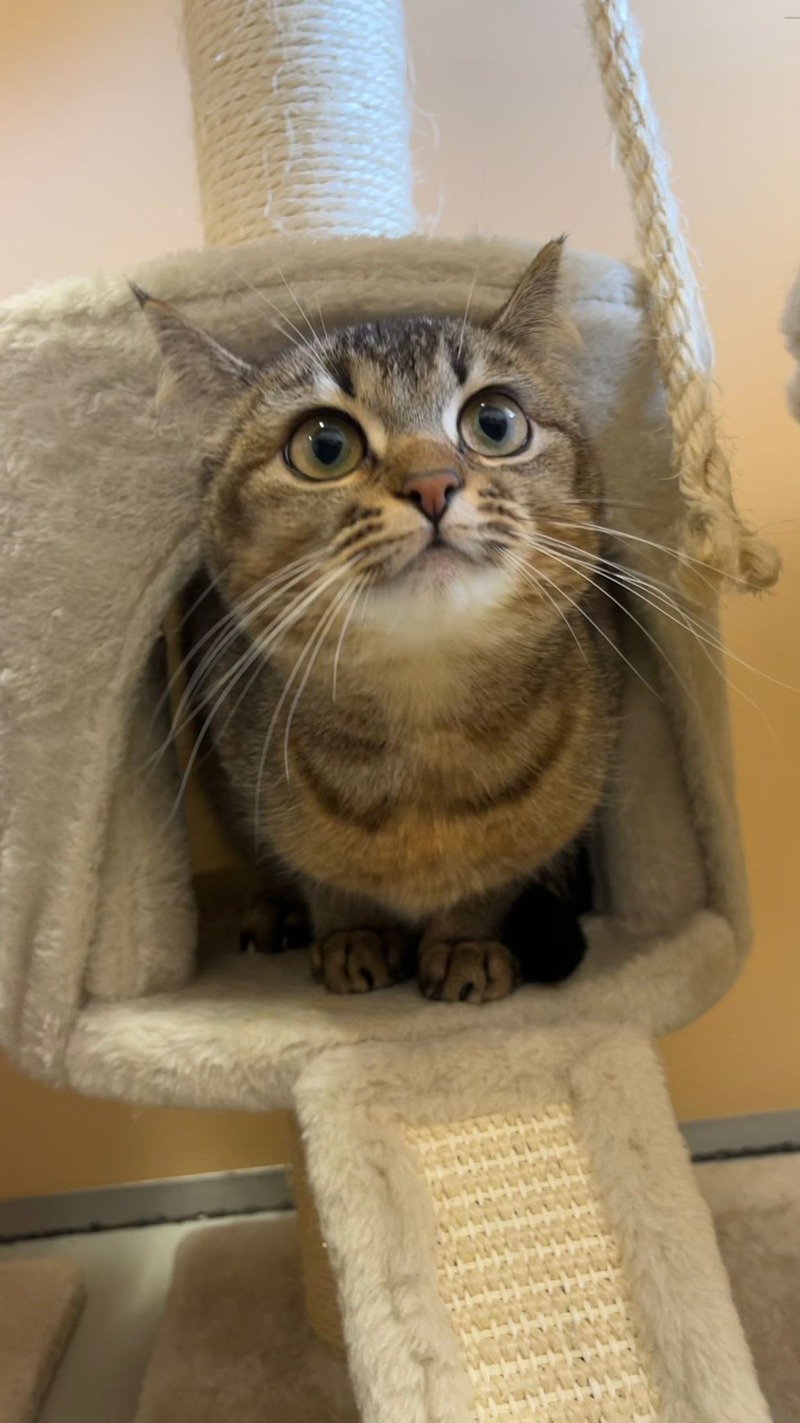 Swami ist anfangs etwas scheu und versuchte sich vor uns zu verstecken, mit ein paar Leckerlis und ruhigem Zureden ist sie aber sehr schnell bereit ihren Kratzbaum zu verlassen und hervorzukommen.